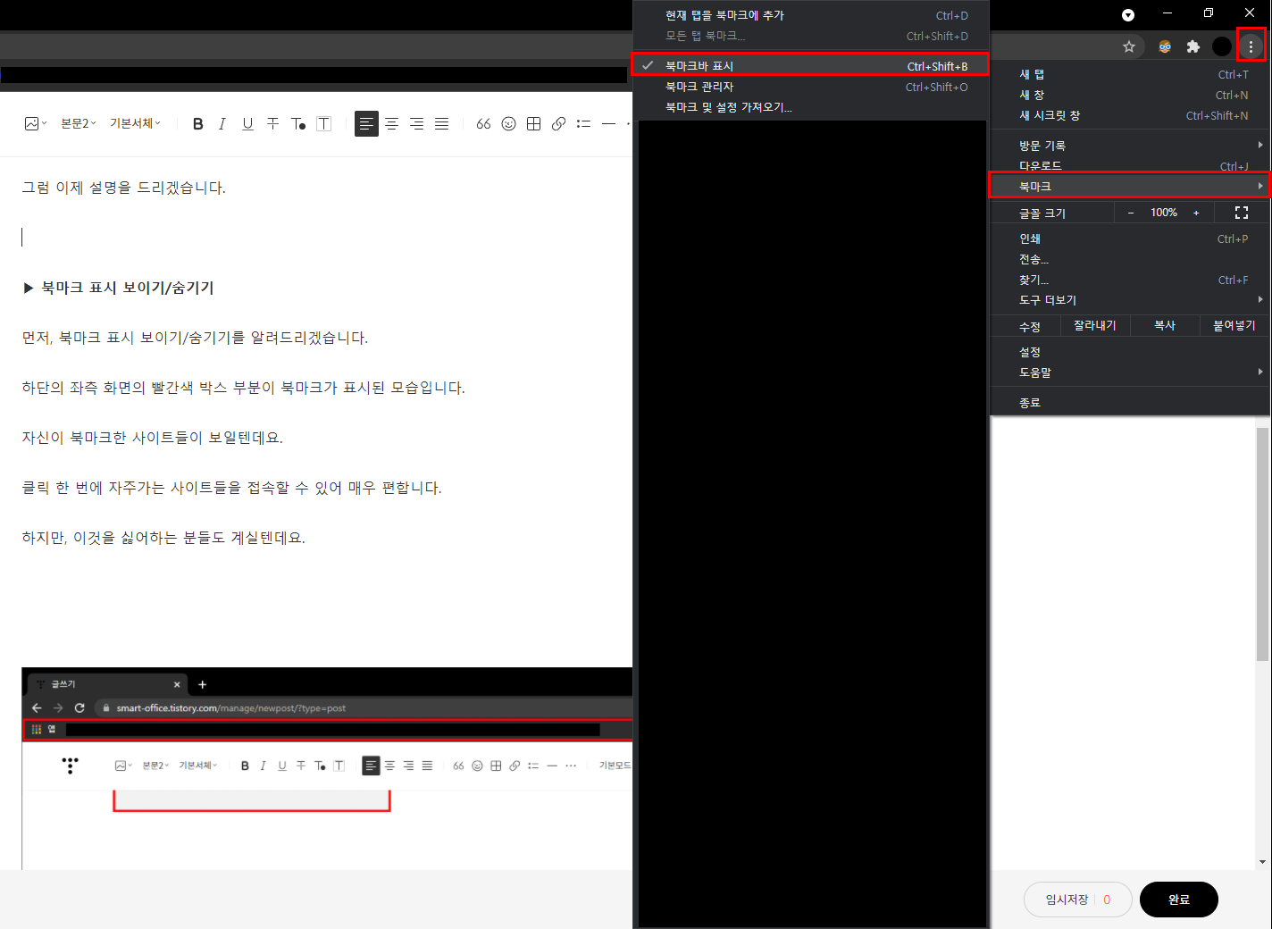 먼저, 북마크 표시 보이기/숨기기를 알려드리겠습니다.